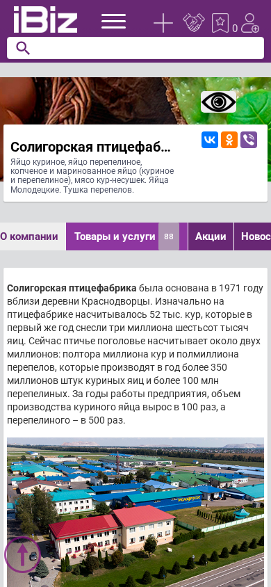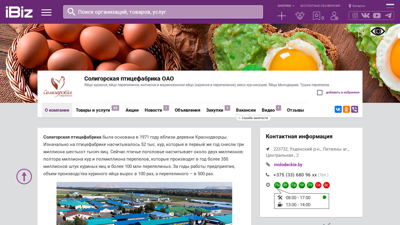 | AI-анализ | The web project "Soligorskaya Pticefabrika OAO" offers a range of poultry products including chicken and guinea fowl eggs, coppiced and marinated eggs (for chicken and guinea fowl), and poultry meat. The brand "Molodeckie" is featured. The company is located in Litvany village, Central District, Minsk region, Belarus. The products are available for retail and wholesale. The website provides information on the company, its offerings, news, and vacancies. The production capacity for chicken eggs has increased 100-fold since its founding in 1971, and for guinea fowl eggs, 500-fold. The farm currently holds around two million birds: 1.5 million chickens and 500,000 guinea fow |