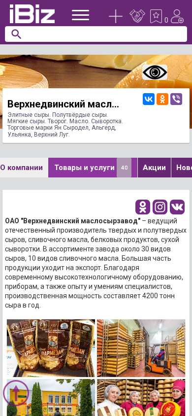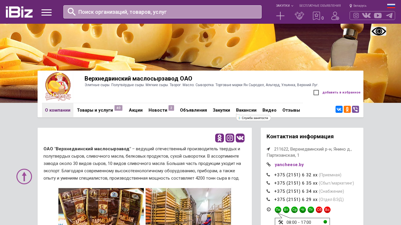 | Название / Заголовок | Верхнедвинский маслосырзавод ОАО - Элитные сыры. Полутвёрдые сыры. Мягкие сыры. Творог. Масло. Сыворотка. Торговые марки Ян Сыродел, Альгерд, Ульянка, Верхний Луг.. 211622, , Янино д., Партизанская, 1 |