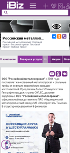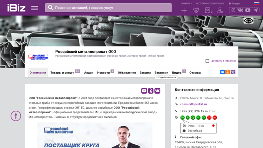 | AI-анализ | language: ru The website is a Russian metal products company, "Российский металлопрокат ООО," located in Minsk, Belarus, at the address К. Либкнехта, 66, офис 36. The company specializes in various types of metal products including sorted metal, fashioned metal, sheet metal, and tube metal. The site provides a map and contact information including phone numbers. The company offers metal products and steel tubes from leading European manufacturers. With over 555 types of steel available, their customer base includes countries in the CIS, the EU, and beyond. The company is an official representative of PJSC "Nadezhdinsky Metallurgical Plant" and MZ "Electrostal Tjumen." They have eight branches and offer a range of steel types including carbon, alloyed, resil |