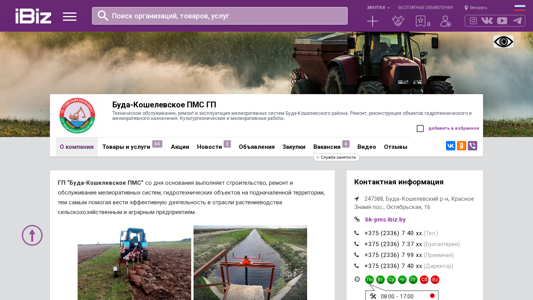 | AI-анализ | The portal bk-pms.ibiz.by is a government agency providing technical servicing, repair, and exploitation of meliorative systems in Buda-Koshelevo District. It offers repair, reconstruction of hydrotechnical and meliorative objects, as well as cultural and meliorative works. The company is located at 247388, Oktiabrskaya, 16, Krasnoye Znamya pos., Minskaya oblast, Belarus. Key services include the maintenance and repair of intra- and inter-company meliorative networks, hydrotechnical objects, cultural works, and transportation services. The company owns specialized repair workshops to maintain its equipment, which is used to perform building and repair works, clearance of roadside overgrowth, and assistance to farmers during planting and harvesting seasons. The team |