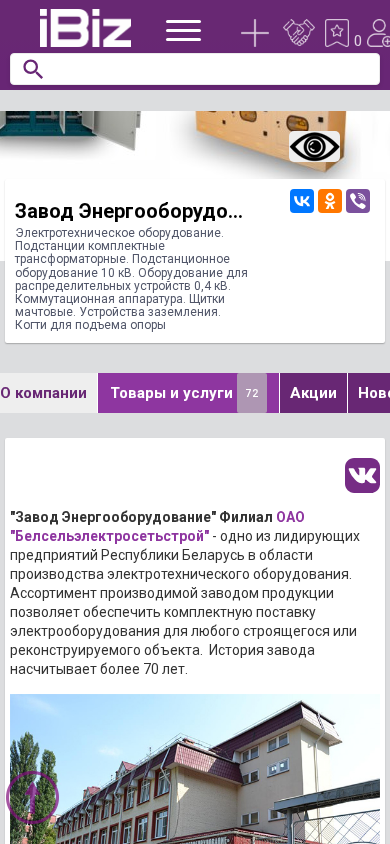| Название / Заголовок | Завод Энергооборудование Филиал ОАО Белсельэлектросетьстрой - Электротехническое оборудование. Подстанции комплектные трансформаторные. Подстанционное оборудование 10 кВ. Оборудование для распределительных устройств 0,4 кВ. Коммутационная аппаратура. Щитки мачтовые. Устройства заземления. Когти для подъема опоры. 246020, Гомель, , Барыкина, 168 |