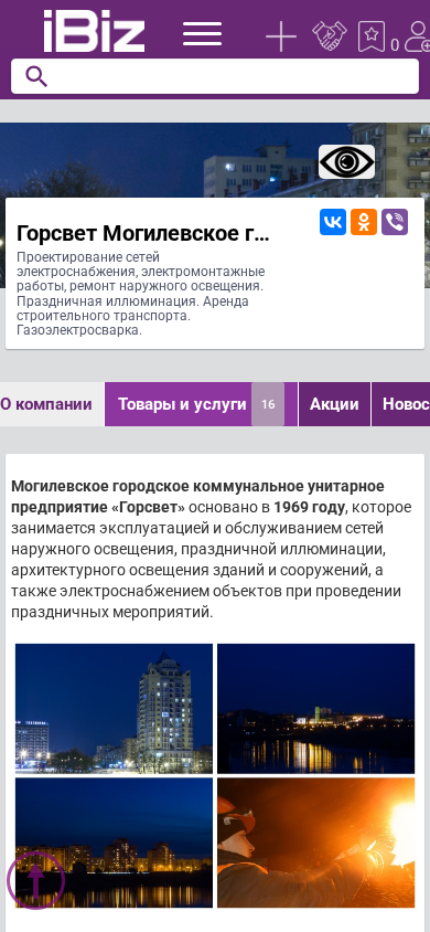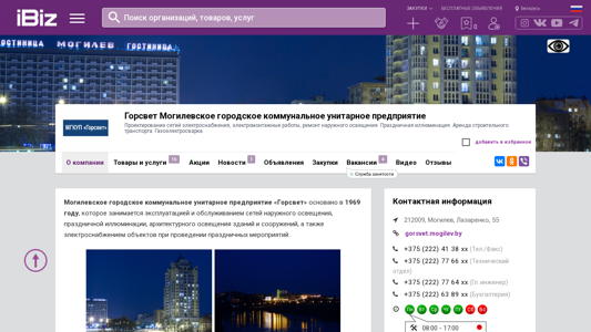 | AI-анализ | The web project "Gorsvet Moгилевское городское коммунальное унитарное предприятие" is a municipal utility company based in Могилев, Belarus, located at 212009, Лазаренко, 55. The company offers services related to the design and installation of electrical networks, electro-installation works, repairs of outdoor lighting, festive illumination, rental of construction transport, and gas electro-welding. The website provides a map for navigation, contact telephone numbers, and the address of the company. The company specializes in the exploitation and maintenance of networks for outdoor lighting, festive illumination, architectural lighting of buildings and structures, and electrical power supply for events. With over 27,321 lighting fixtures and 953.7 km of outdoor electrical networks in operation, the company's structural |