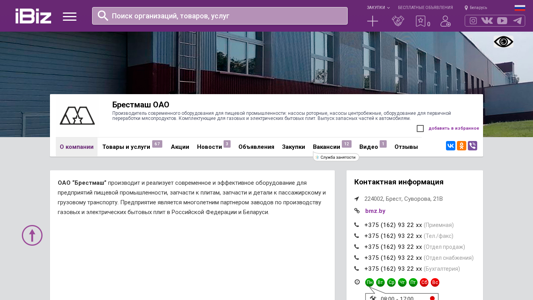 | Название / Заголовок | Брестмаш ОАО - Производитель современного оборудования для пищевой промышленности: насосы роторные, насосы центробежные, оборудование для первичной переработки мясопродуктов. Комплектующие для газовых и электрических бытовых плит. Выпуск запасных частей к автомобилям.. 224002, Брест, , Суворова, 21В |