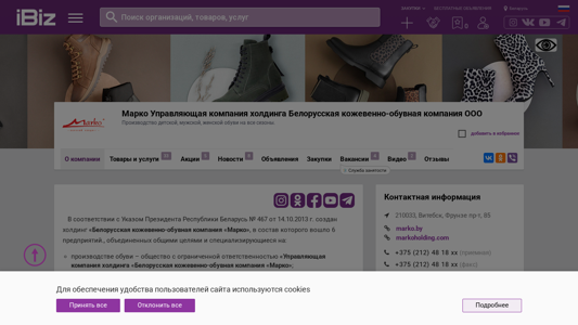 | AI-анализ | The portal is a Belarusian business website for Marko, a holding company of the Belarusian leather footwear manufacturer Belorusskaya kozhevnno-obuvnaya kompaniya OOO. The company specializes in the production of children's, men's, and women's footwear for all seasons. The website provides information about the company, its products, and services, as well as contact details and a location map. The company was established in 1991 and focused on the production of men's footwear from natural leather. In 1995, it began producing children's footwear, expanding its product range to include women's footwear. The holding company, which also includes several other production and retail entities, aims to continuously develop and perfect the technology of comfort. |