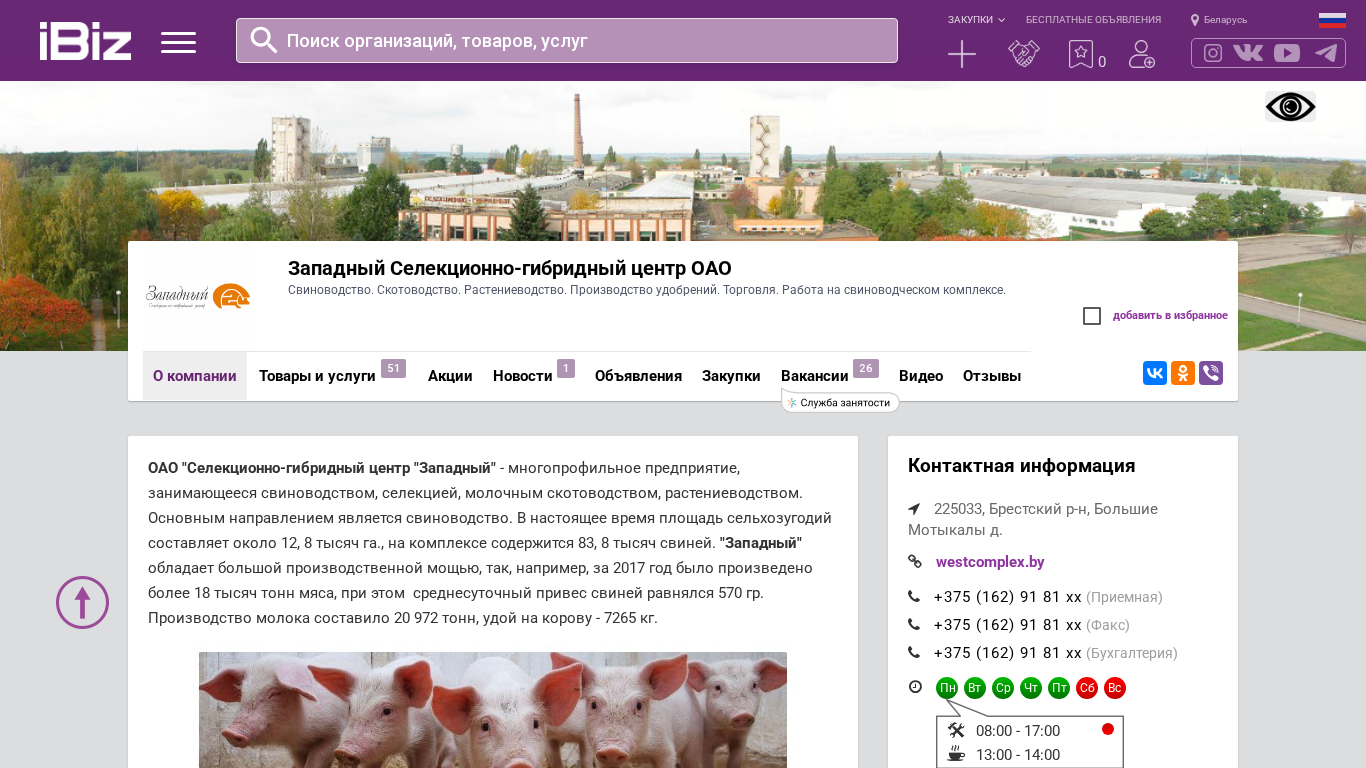 | AI-анализ | This website is for the Western Selection-Breeding Center OAO, which specializes in swine farming, cattle breeding, agriculture, and the production of fertilizers and engages in trade and employment at the swine farm complex. The company is located in the village of Big Motykalys, Minsk region, Belarus, with the address and contact phone numbers provided. The website includes sections for free classified ads, company information, products and services, news, and vacancies. The main focus is on swine farming, with approximately 12,800 ha of agricultural land and over 83,800 swine on the farm. The center boasts a large production capacity, producing over 18,000 tons of meat and 20,972 tons of milk in 2017, with an average weight gain of 570 |