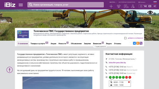 | AI-анализ | The portal is a state enterprise named 'Толочинское ПМС', offering various construction and land improvement services. These include meliorative works, construction of meliorative structures, earthworks, and finishing works. The enterprise also rents out both building and specialized construction technology, and sells natural honey produced on site. The company's location is in Tолочин, , at Мелиораторов, 1. The website provides a scheme for reaching the enterprise, as well as contact telephone numbers and the address. The main activities of the enterprise are the exploitation of meliorative systems, and the production of construction works for industrial, civilian, and agricultural building projects, focusing on road, hydrotechnical, and meliorative infrastructure. The enterprise employs approximately 78 people, who ensure high-quality work. The equipment inventory includes six single-bucket excavators, two multi-bucket |