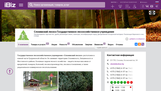 | AI-анализ | This online resource represents the state-owned forestry enterprise "Slonimsky Leshoz" - Pilomaterials. The organization deals with round timber, wood chips, seed and sapling sales, as well as forest-forming species. Decorative planting materials are also offered for sale. Additionally, birch sap and birch honey are provided. The company is located in Slonim, Belarus, with the address Космонавтов, 34. Contact information, including telephone numbers and a map, are available on the website. The enterprise includes 20 forestry units, a permanent forest nursery, 89 forestry patrols, and 7 forestry stations. There are also a wood processing plant, a lumber yard, and repair and mechanical workshops. Forestry stations: Albertinsky Lesnicherstvo (Slonim, ul. Kolhoz |