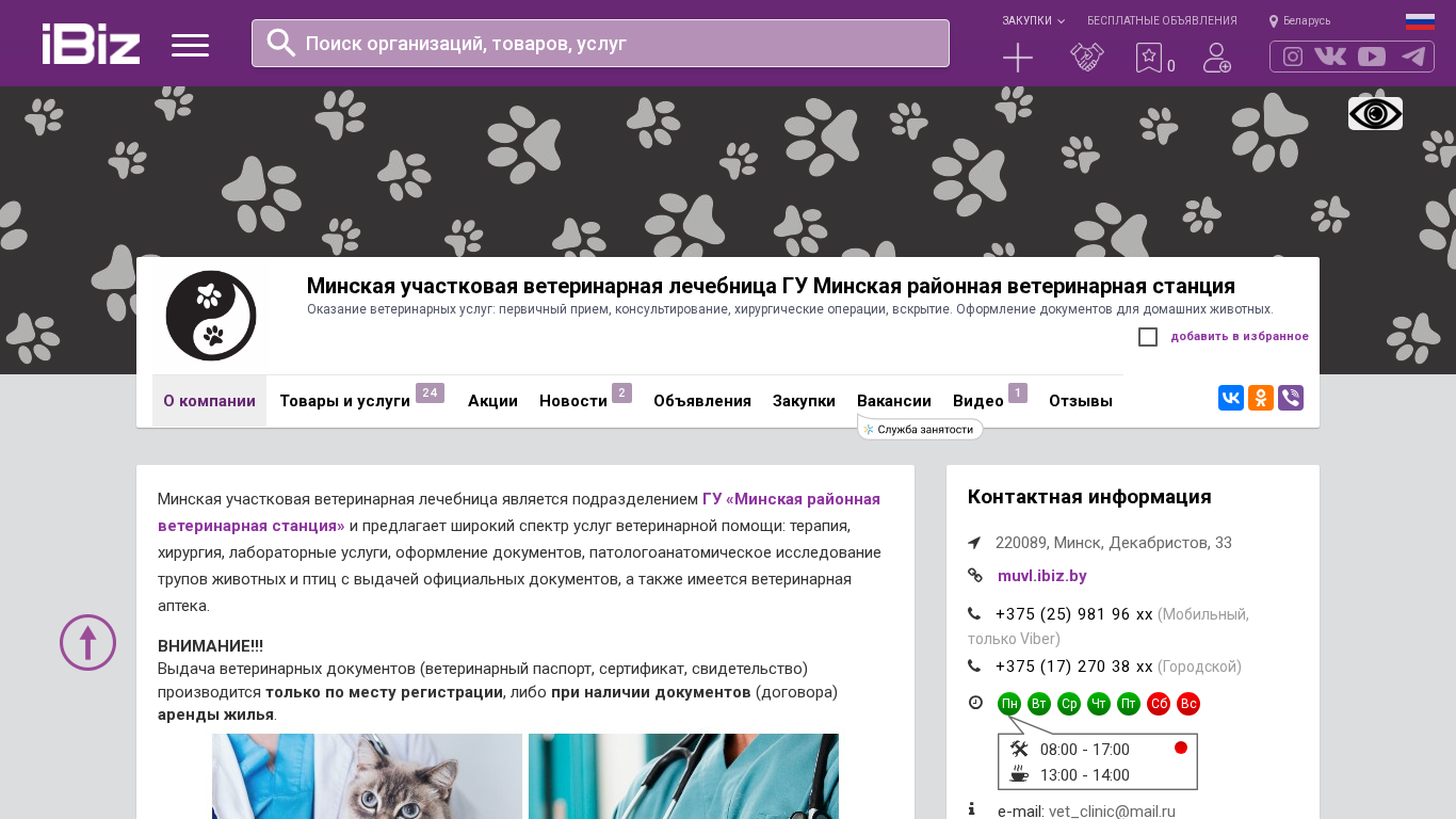 | Название / Заголовок | Минская участковая ветеринарная лечебница ГУ Минская районная ветеринарная станция - Оказание ветеринарных услуг: первичный прием, консультирование, хирургические операции, вскрытие. Оформление документов для домашних животных.. 220089, Минск, , Декабристов, 33 |