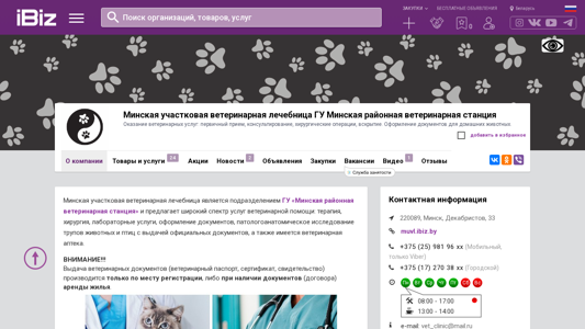 | AI-анализ | The website is a veterinary clinic, part of the Minsk Regional Veterinary Station, located at Decabriovs 33 in Minsk, Belarus. It offers various veterinary services, including primary care, consultation, surgical procedures, and document issuance for domestic animals. The clinic provides therapy, surgery, laboratory services, pathology analysis, and a veterinary pharmacy. A veterinary doctor can also be called to your home for service. The staff consists of highly qualified specialists. Services include consultations for pet care, document issuance, preventative vaccinations, microchipping, castration/sterilization, and ultrasonic tooth cleaning. Please note that document issuance is only available for registered pets or with proper documentation for rented accommodations. |