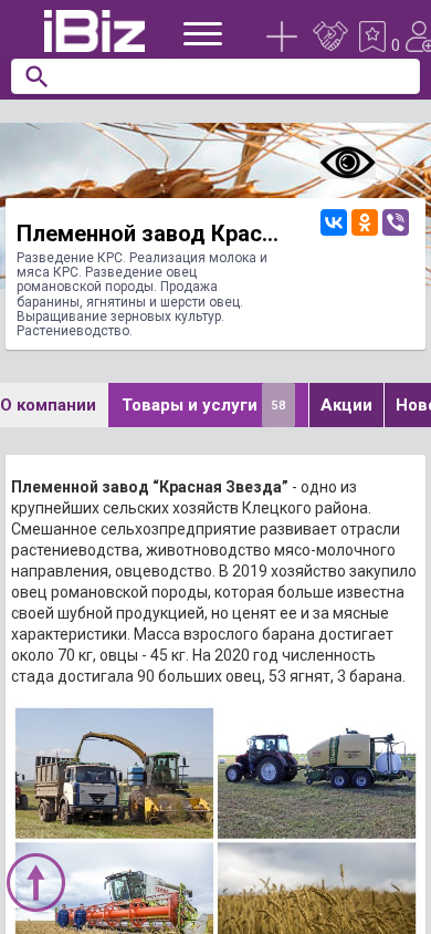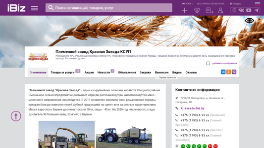 | AI-анализ | The website is a farming enterprise named Красная Звезда КСУП, specializing in cattle breeding, milk and meat production, sheep breeding for wool and meat, and agriculture. The farm acquired Romangovka sheep breed in 2019, known for its wool production but also valued for its meat qualities. The average weight of an adult Romangovka sheep is around 45 kg, while a mature ram can reach up to 70 kg. The farm had a total of 90 large Romangovka ewes, 53 lambs, and 3 rams as of 2020. Kr-zvezda.ibiz.by produces and sells meat, milk from Cattle, Romangovka mutton, lamb, wool, cattle feed, and various agricultural products. The farm continues to expand its production, increasing the yield of |