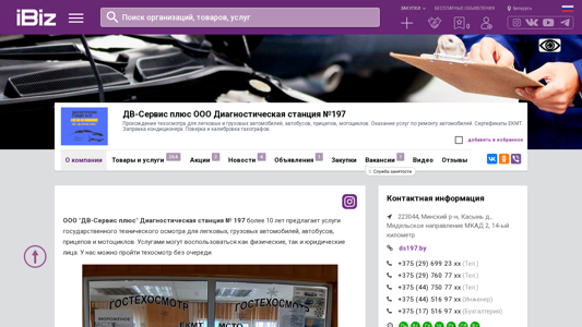 | Название / Заголовок | ДВ-Сервис плюс ООО Диагностическая станция №197 - Прохождение техосмотра для легковых и грузовых автомобилей, автобусов, прицепов, мотоциклов. Оказание услуг по ремонту автомобилей. Сертификаты ЕКМТ. Заправка кондиционера. Поверка и калибровка тахографов.. 223044, , Касынь д., Мядельское направление МКАД 2, 14-ый километр |
