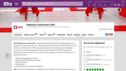 | AI-анализ | The website "Мобильные ТелеСистемы СООО" (mts.ibiz.by) is a company based in Минск, Belarus, providing services for mobile communication, mobile internet, TV, and home internet. The company is located at Независимости пр-т , 95 -4, and offers various additional services such as roaming, international calls, mobile and unlimited internet, voicemail, business solutions, and entertainment services. MTS is a leading operator of mobile communication and fixed internet in the CIS countries, with shareholders being RUP "Белтелеком" and PJSC "Мобильные ТеleСистемы". The company holds an ISO 9001 quality management certification. MTS offers competitive tariffs for phone calls and internet, as well as various other services. The company |