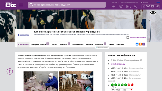 | AI-анализ | This online resource is dedicated to the "Кобринская районная ветеринарная станция Учреждение" (Cobrin Regional Veterinary Station), which offers veterinary services and consultations. The station specializes in treatment, prevention, vaccination, laboratory testing, and veterinary-sanitary surveillance for both domestic pets and farm animals. The website provides a map for navigation, contact information, and the address of the company: 225306, Кобрин, , Красноармейская, 82. The main focus of the station is to improve animal health and combat diseases, offering a wide range of veterinary services including therapy, surgery, obstetrics and gynecology, laboratory tests, oxygen therapy, vaccination, dental cleaning, castration/sterilization, and document issuance for travel. The team consists of experienced and qualified professionals with higher education |