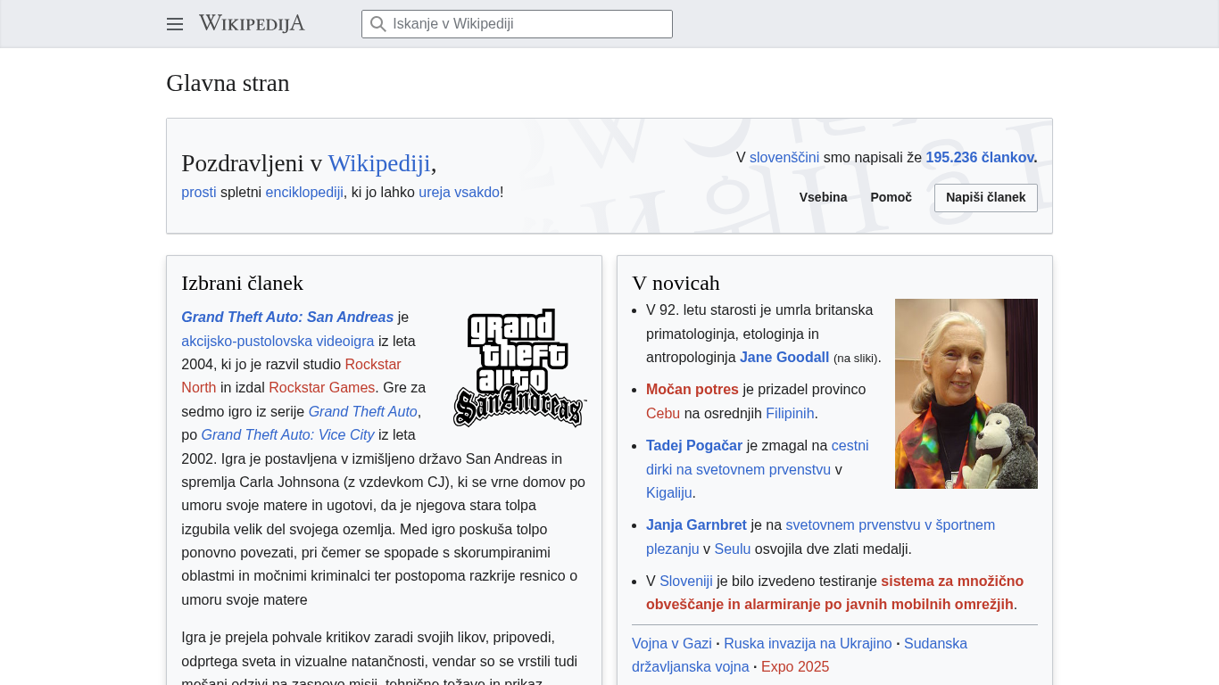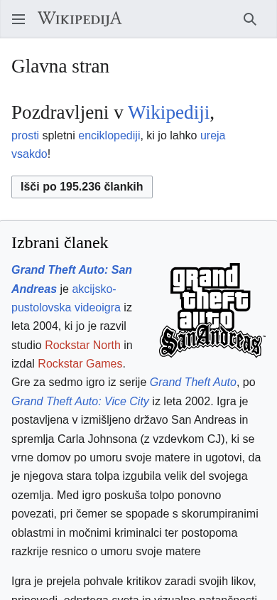 | AI-анализ | --- This online resource is titled "Wikipedija" and is a popular portal for the free web-based encyclopedia in the Slovenian language. The description includes mentions of 195,236 articles written in Slovenian, and an invitation for users to contribute and write new articles. The website also features a selected article on the video game Grand Theft Auto: San Andreas, which was released in 2004 and is known for its open world, engaging storyline, and complex characters. Users can also find information on historical events, such as the oldest known opera, Perseo e Andromeda, which was performed in Florence in 1600, or the Citroën 2CV, a car model introduced in 1948 and commonly known as "spaček" in Slovenia. Additionally, the website provides information |