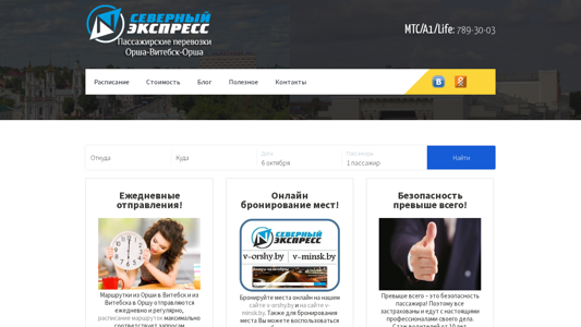 | AI-анализ | --- This online resource is an official website for the bus route from Vitebsk to Orsha and back, with a fare of 4 rubles. The website provides information on schedules and online ticket booking. The title of the website is "Маршрутка Витебск-Орша-Витебск" and keywords include "маршрутка Витебск Орша," "орша витебск," "северный экспресс," and various combinations of those terms. The top words in the data are "витебск" (8 occurrences), "стоимость" (6), "маршрутки" (5), and "орша" (4). The website offers daily departures for the bus route from Vitebsk to Orsha and back, and features an online ticket booking system, as well as |