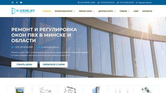 | AI-анализ | --- The website is an online platform offering window repair, regulation, and replacement services in Minsk, Belarus. It specializes in PVC windows, regulating window functionality and repairing glass packages. The company boasts a long-term experience and low prices. The site includes sections for various types of mosquito nets, door and window fittings, and other related services such as door installation, balcony glazing, and threshold installation. Additionally, it offers various accessories for mosquito nets, window insulation, and safety features including child locks and protective glass. The contact information is provided for inquiries and appointments. |