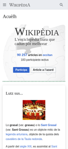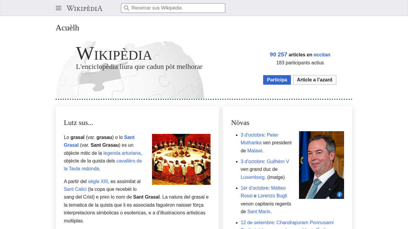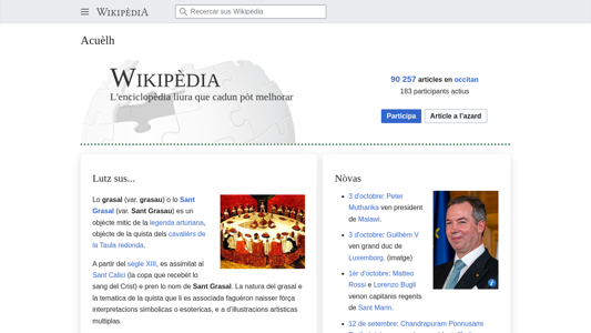 | AI-анализ | This online resource is the Occitan Wikipedia, an encyclopedia in the Occitan language with over 90,000 articles and 257 articles in progress. The website offers a search function, configuration options, and a donation link. Topics covered include mythic objects like the Grail and the Sant Grasal, historical figures such as Gilbert du Motier de La Fayette, and various geographical locations and events. The site also includes articles on contemporary figures and recent news, such as the election of Anutin Charnvirakul as Prime Minister of Thailand and the discovery of a new satellite of Uranus. The domain is oc.wikipedia.org. |