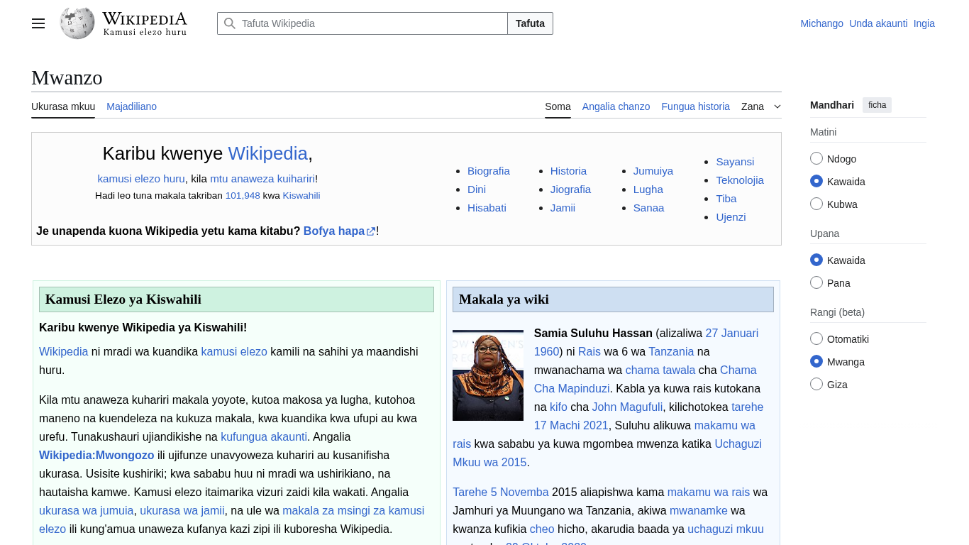 | Canonical URL | https://sw.wikipedia.org/wiki/Mwanzo |