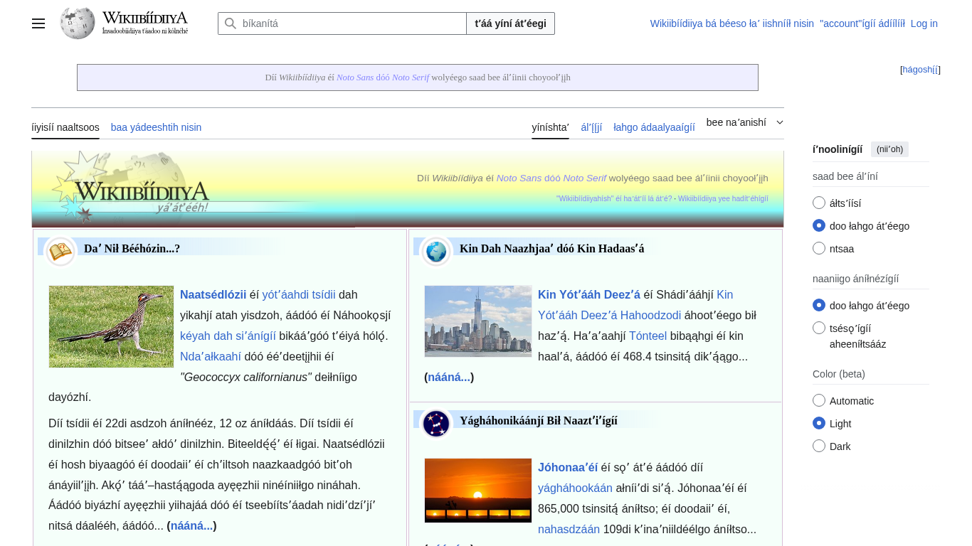 | AI-анализ | The web project Wikiibíídiiya Dinék'ehjí (Navajo) is a Wikimedia Foundation project for the Navajo language. The website title translates to "Navajo Wikipedia - Yá'át'ééh!" in the Navajo language. The description includes phrases like "jump to content," "log in," and "actions," which suggest a typical Wikimedia Foundation website layout. The top words include "wikiib," "diiya," "bik," and "naaltsoos," which are likely Navajo language terms. The website uses the Noto Sans and Noto Serif fonts. The date "3, 2025go" appears at the bottom of the page, suggesting the website was last updated in 2025. The website includes links to various Wikimedia Foundation projects, such as Wikimedia Commons and Wikidata. The website  |