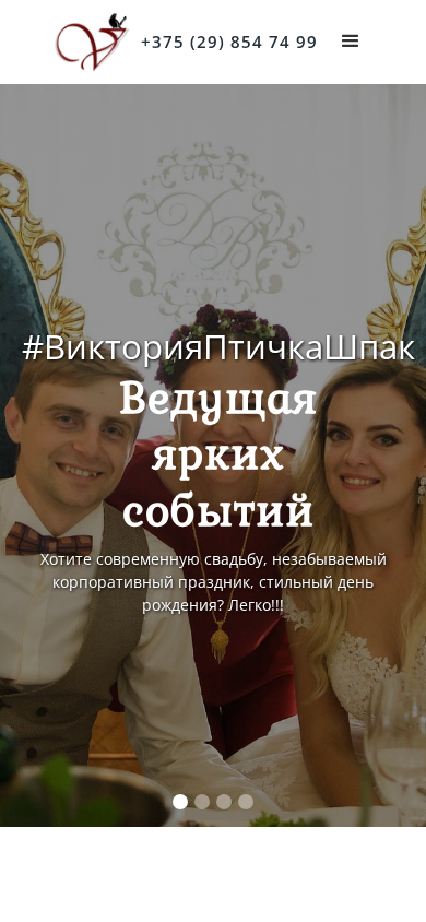 | AI-анализ | The website is for a wedding and event planning service called Victoria Ptichka Shpak. The description emphasizes the ability to create modern and memorable events, including weddings, corporate parties, and birthday celebrations. The website's title and repeated phrases suggest a lively and energetic host who can create a harmonious atmosphere for various age groups. The website also offers services such as DJ, technical equipment, event decoration, and photography. The website has been successful for four years and has received multiple awards in the event industry. The owner of the website, Victoria Ptichka Shpak, is a professional event host who has experience in corporate events, wedding ceremonies, and conferences. She promises to create a light and unpretentious atmosphere for events, bringing together guests of all ages with creative and original ideas, a good sense of humor, and positive energy. The website offers a range of services for weddings  |
