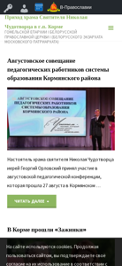 | AI-анализ | The website is for the Orthodox Christian parish of Saint Nicholas the Wonderworker in Korma, part of the Homiel Eparchy and the Belarusian Orthodox Church (Belarusian Exarchate of the Moscow Patriarchate). The site includes information on the history of the church, its dedication, and upcoming events such as a pedagogical conference and the blessing of water on the feast day of the church's patron saint. The site also mentions a visit to the Svyatogorskaya Lavra and a family day celebration. The site uses the keywords "church," "parish," "Orthodox," "Belarusian," "patriarchate," and "Moscow," among others. The title of the site is "Приход храма Святителя Николая Чудотворца в г.п. Корме" (Par |