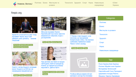 | AI-анализ | This website is a Ukrainian news platform covering various topics including politics, business, arts and entertainment, technology, health, sports, and science. The title of the website is "Новини, Вогонь!" which translates to "News, Fire!" in English. The description of the website mentions several news stories related to politics, the European Union's potential support for Ukraine, the approval of the EU budget for 2025, and the appointment of a new football coach in Monaco. Additionally, there are stories about a documentary film by Sarajessica Parker and Alexander Teren, a fire in California, and a potential alternative to Russian gas in Europe. The domain name is "firepic.org". |