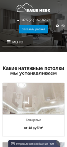 | AI-анализ | The portal is a website for purchasing affordable stretching ceilings in Minsk and the surrounding area. The site offers low prices per square meter, a free measurement service, quality assurance, and a clean installation process. The product range includes various types of ceilings such as glossy, matte, satin, fabric, exclusive, classical, mansard, combined, textured, seamless, curved, French, PVC, and eco-ceilings. Customers can choose from various colors including black-white, blue, champagne, beige, white, burgundy, yellow, green, coral, perlamutr, under concrete, under wood, under marble, grey, blue, lilac, purple, and black. The company offers installation under various roofs, including kitchens, corridors, living rooms, bedrooms, children's rooms, bathrooms, |