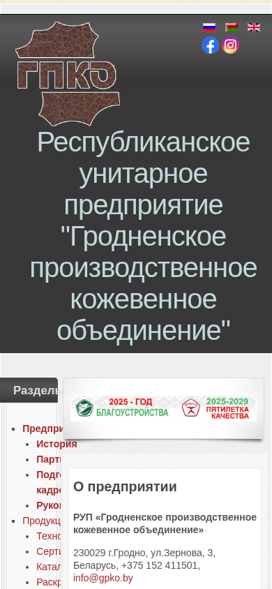 | Ключевые слова | ГПКО гродненское кожевенное объединение обработка кожевенного сырья продажа готового кожевенного товара кожа чепрак юфть подкладка галантерейная wet blue |