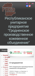 | AI-анализ | The web project "Grodno Production Leather Combine" is a Belarusian state-owned enterprise, located in Grodno, specializing in the production of a wide range of leather products. The company's main output includes various types of leather for different applications: shoe-leather, work boots, orthopedic footwear, chrome-tanned leather for uppers, chrome-tanned leather for soles, chrome-tanned leather for gloves and mittens, and leather for upholstery and garment industry. The enterprise operates under the parent company "Bellegprom" and has been in business for over a century. It occupies a 2.78 hectare area and produces leather for both local and international markets, including Belarus, Russia, Poland, Italy, and Kazakhstan. The company employs over 2,000 people |
