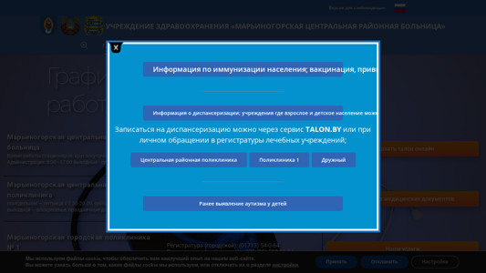 | AI-анализ | This website belongs to the Central Regional Hospital of Mariyino Gorod in Belarus. The title is "Марьиногорская ЦРБ" and it provides information about the hospital, including its structure, leadership, administrative procedures, and services. Keywords associated with the website include "2025," "read," "more," "2024," "2023," "сентября," "июня," "день," "апреля," "школа," "гуо," "подробнее," "марта," "января," "ноября," "средняя," "мероприятие," "мая," "cookie," "октября," and various medical terms. The website also offers paid services such as doctor's consultations, disability assistance, and social support for families with disabled children. Additionally, it |