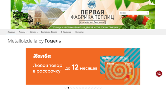 | AI-анализ | The web project "Metalloizdelia.by" is a e-commerce website based in Goemle, Belarus, offering services for the production of metal constructions and metal goods. The website's title is "Изготовление металлоконструкций и металлоизделий в Гомеле" (Manufacturing of metal constructions and metal goods in Goemle). The description states that customers can order a metal construction for a dacha or a house with a full installation service. The top keywords include "изготовление" (manufacturing), "гомель" (Goemle), "ворота" (gates), "теплицы" (greenhouses), and "поликарбоната" (polycarbonate). The website also offers various types of greenhouses, ovens, gates, fences, and other |