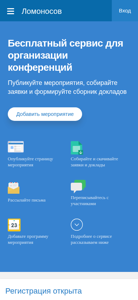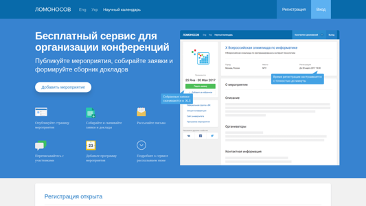 | AI-анализ | The website "Lomonosov" is a scientific network for organizing events and forums for scholars and intellectual youth. The platform offers a calendar of events, registration and entry for conferences, publication of event pages, collection and download of registrations and reports, and communication with participants. The service is free and open for registration. The website includes information about various conferences, such as the International Conference on Fusion Materials ICFM-2025, the XII Valentteevskie Readings, and the MCC-2025 conference, among others. Users can create an event page by providing the title, dates, and description, and can also download the registration form and announce the event on other calendars to increase attendance. The registration and call for papers forms can be customized, and automated PDF generation is available. The website also includes a social network feature, allowing users to communicate with each other |