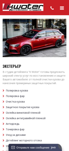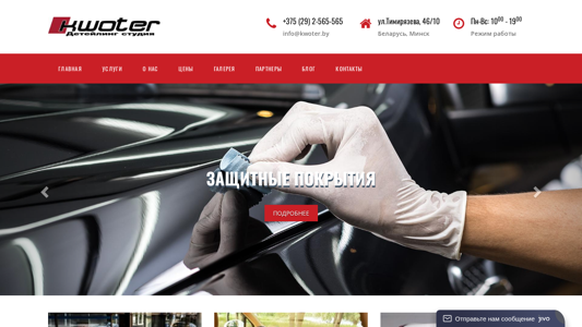 | AI-анализ | The web project "Детейлинг студия KWoter" offers car detailing services in Minsk at the best price in the city. The company KWoter provides car detailing and final wash for an excellent value. Services include exterior and interior detailing, engine cleaning, and protective coatings. The menu includes options for body polishing, painting, car glass tinting, and car underbody protection. The studio also offers restoration of leather interiors and ozone treatment for the cabin. Contact information is provided. Open Monday to Sunday, 10:00 AM to 7:00 PM. |