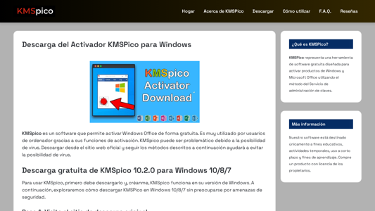 | AI-анализ | This online resource is a website dedicated to providing users with information and a download link for KMSPico, a software tool used to activate Microsoft Office and Windows without the need for a license key. The website's title reflects this purpose, with the keyword "descargar" (download) and specific references to KMSPico and various Windows versions. The description also mentions that the site is the official one for KMSPico and that users can download the software for free. The top words suggest that the website is primarily focused on KMSPico, Windows, and downloading, with some mentions of activation, office, and virus concerns. The text on the site explains how to download and install KMSPico, with a warning about potential virus risks and instructions to download from the official website to minimize these risks. The website also includes sections for FAQ, reviews, and a download link for KMSPico |