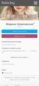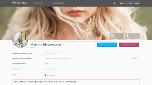 | AI-анализ | The web project "Фотограф Марина Шавловская, Гомель" is a photography site belonging to Marina Shavlovskaya, a photographer from the city of Гомель, Belarus. The site features a category dedicated to "Детская фотосъемка" (Child Photography), along with other categories such as portraits, weddings, families, and photo session content. The photographer's services include various types of photography, including individual sessions, industrial photography, and re-touching. The site also provides information on pricing and contact details. The site is part of the "foto.by" domain. |