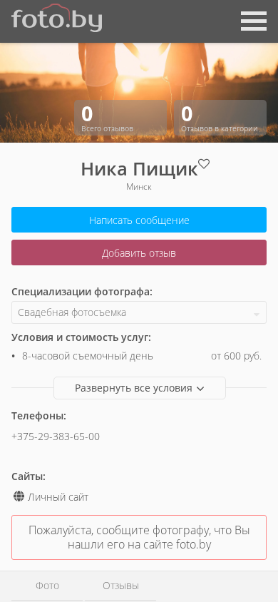 | SEO-описание | Фотографии в категории "Свадебная фотосъемка". Фотограф Ника Пищик - выполняю следующие виды фотосъемок: love story, портретная фотосъемка, фотосъемка мероприятий. Работаю в городах: Минск |