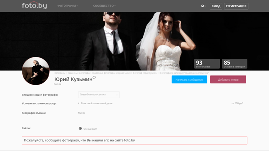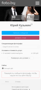 | AI-анализ | The web project "Фотограф Юрий Кузьмин, Минск" is a photography portfolio showcasing works by a wedding photographer based in Minsk, Belarus. The website is part of the Foto.by network and is primarily focused on the "Свадебная фотосъемка" (Wedding Photography) category. The site includes a catalog of photographers, with a prominent position given to Юрий Кузьмин. The site also features a community for photographers, as well as various other photography-related categories and resources. The website received 85 unique visitor reviews in total, with 93 of those reviews specifically for wedding photographers in the city of Минск. The photographer's specialties include wedding photography, Love Story photography, and photography for graduation events. Pricing and other details for his services, as well as his |