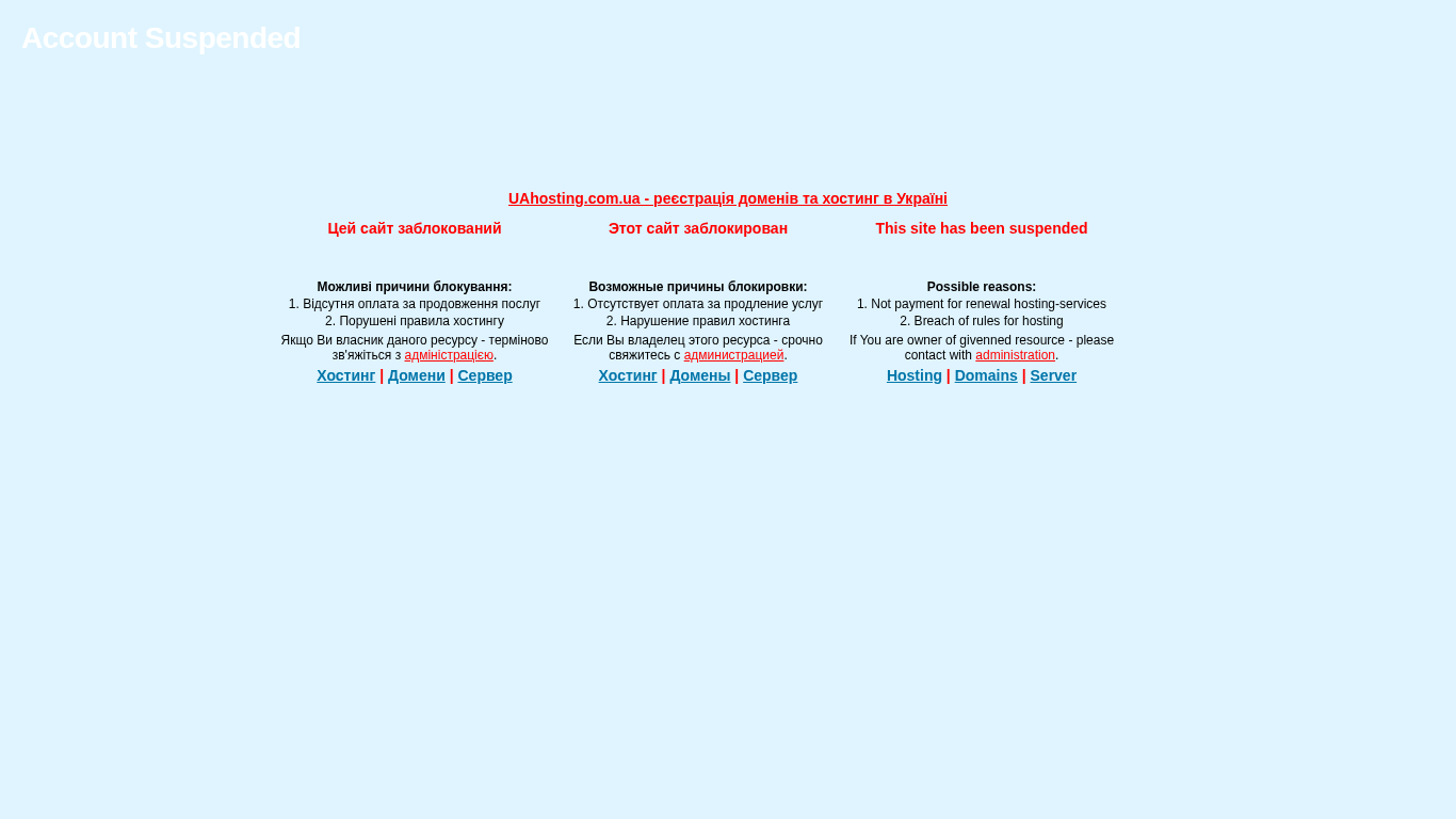 | Название / Заголовок | Account Suspended by uahosting.com.ua |