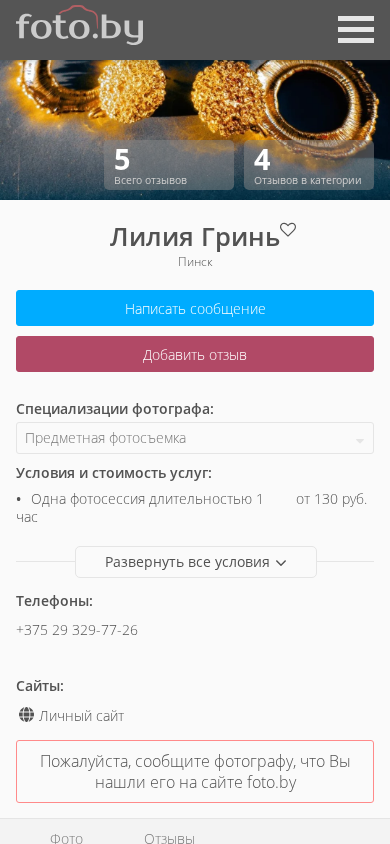 | AI-анализ | This online resource is a website for photographer Lilia Hryn of Pinsk, Belarus, specializing in subject photography. The site features a catalog of photographers, with Lilia's work categorized under "Subject Photography." Lilia identifies herself as a subject photographer (content photographer) based in Minsk. The website includes sections for various types of photography services such as automobile, animal, architecture, children, and more. Users can also find information about community activities, blog, announcements, and contacts. The site was accessed on July 9, 2025, and had five reviews in the subject photography category. Lilia offers her services as a subject photographer and content photographer in Pinsk. The cost for a one-hour photo session starts at 130 rubles. The photography services are limited to Pinsk. The website provides contact information, including a phone number |