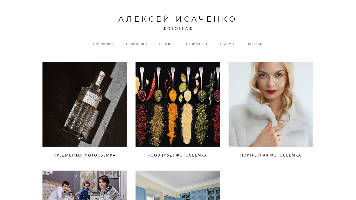 | SEO-описание | Фотограф Алексей Исаченко - выполняю следующие виды фотосъемок: портретная фотосъемка, съемка еды и напитков, предметная фотосъемка, рекламная фотосъемка. Работаю во всех городах Беларуси |