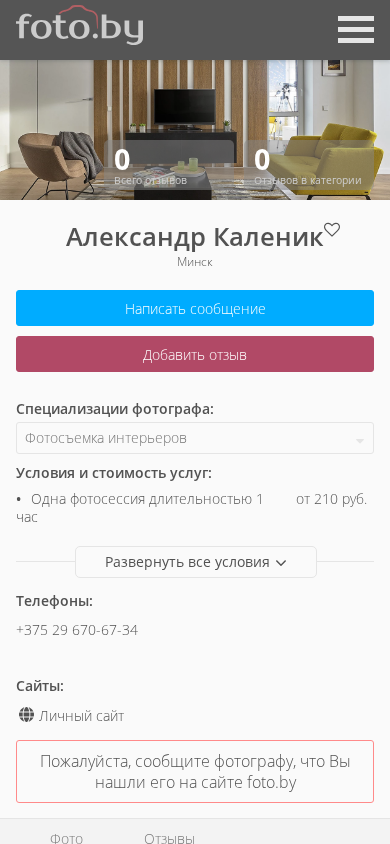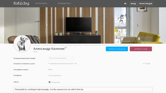 | AI-анализ | The portal showcases the photographic works of Alexander Kalenik, a photographer based in Minsk, Belarus. The website is primarily focused on interior photography, with a large collection of images in this category. Visitors can explore various categories of photography offered by Alexander, such as architectural photography, portraits, and more. The website also includes a community section for users to leave reviews and engage with other photographers. The main page displays a catalog of photographers, with Alexander's portfolio featured prominently. Users can contact him through provided phone numbers or his personal website for inquiries and to book photo sessions. The website also includes information on pricing and shooting locations, specifically in Minsk. |