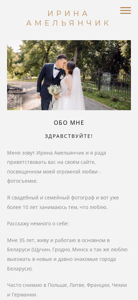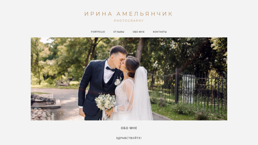 | AI-анализ | This website belongs to Irina Amelyanchik, a wedding and family photographer based in the cities of Щучин, Лида, Гродно, and Минск in Belarus. The website features a portfolio of her work, which includes wedding, family, child, pregnancy, and individual photography, as well as advertising and Christening photos. The title and description of the website emphasize the emotional depth and sincerity of her photography. The top words associated with the website include "photo," "Irina Amelyanchik," "photographer," "wedding," "family," and "children." The website also includes a section for reviews, information about the photographer, and contact details. Irina Amelyanchik has studied and continues to study photography as an art form and works with professional Canon and Sigma equipment. The website is hosted on the foto.by |