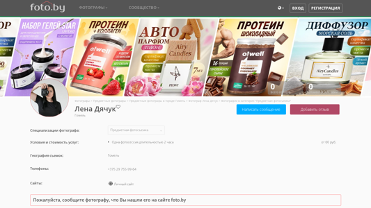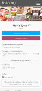 | AI-анализ | This online resource is a professional photography studio website operated by Lenya Dzyachuk in the city of Homel, Belarus. The main focus of the website is on product photography, which can be used for various online platforms, such as marketplaces, social networks, and personal websites. The photographer offers on-site photography sessions with professional equipment and delivers card-packaged photos upon request. The website provides a catalog of photographers, with Lenya Dzyachuk's profile and portfolio being one of the entries. The site also features a community of photographers, allowing users to view various works, leave reviews, and contact photographers directly. The site offers photography services for various categories, including products, interiors, and events. Prices for a two-hour photography session start from 60 rubles. The photographer's geographic coverage is limited to Homel. Contact information includes a phone number and |