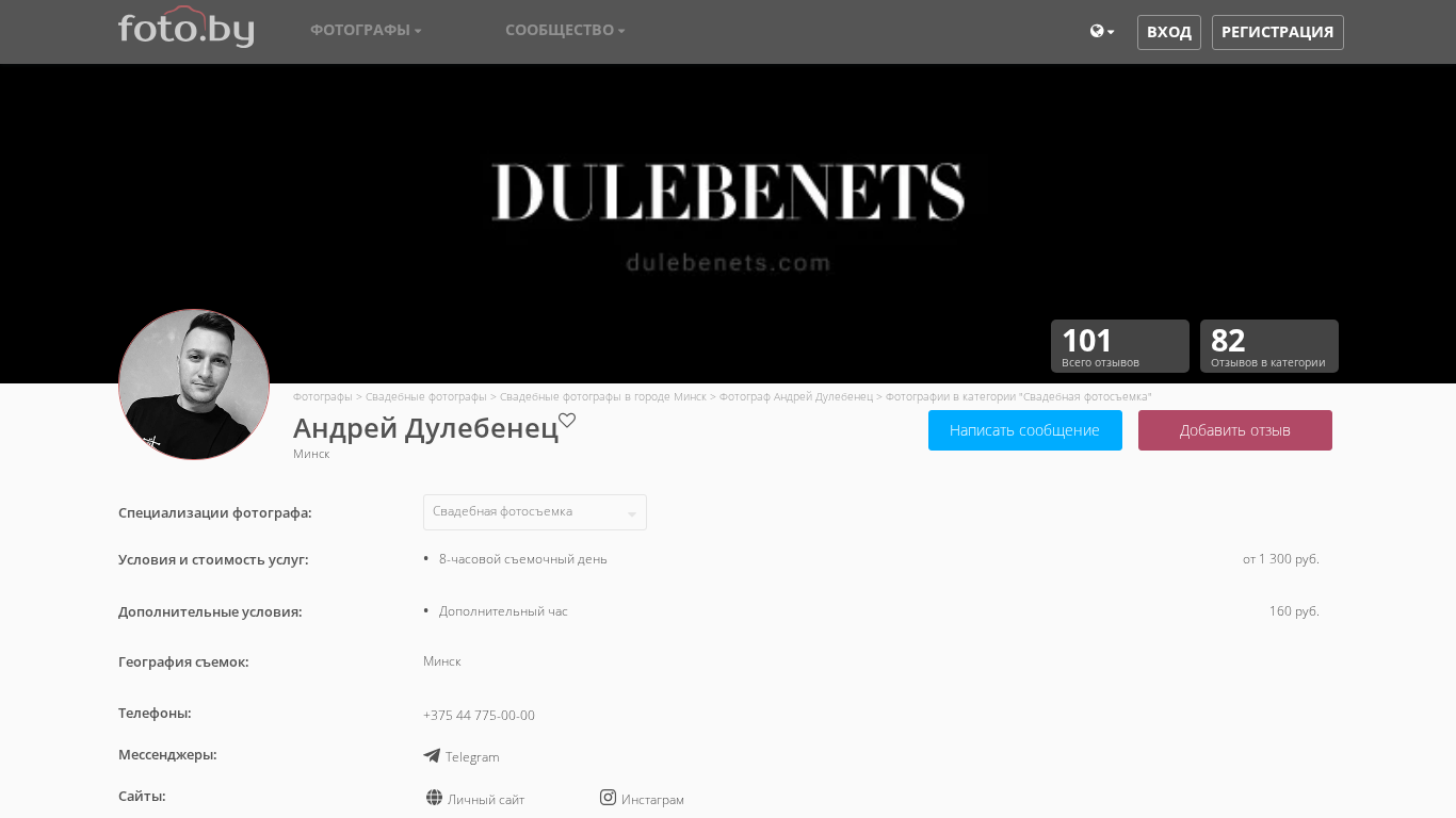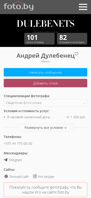 | AI-анализ | The website is dedicated to the work of photographer Andrey Dulebenec based in Minsk, Belarus. It primarily features photographs in the "Wedding Photography" category, with services offered in various cities across Belarus. The site also mentions the production of high-quality photobooks. Keywords associated with the website include "photography," "wedding," "Minsk," and "photographer," among others. The website has received 101 reviews, all in the "Wedding Photographers" category, with a total of 82 unique visitors. The photographer's specialties include wedding photography, Love Story sessions, and 3D and object photography, among others. Pricing and booking information is not provided on the main page, but additional details can be found by contacting the photographer through the site's messaging feature or by phone. The |