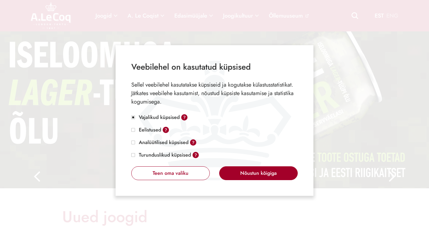 | SEO-описание | A. Le Coq on Eesti vanim ja suurim joogitootja, kelle tootevalikust leiab 11 erinevat tootegruppi. Neist suurim on õllede tooteportfell, järgnevad mahl, vesi ja karastusjook ning ülejäänud tootegrupid – siidrid, lahjad alkohoolsed joogid, Active mahlajoogid, spordi- ja energiajoogid, siirupid ning kali. |