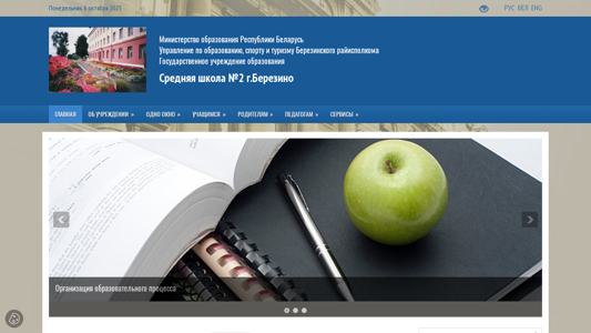 | AI-анализ | --- The web project "Middle School #2 in Berezino" is a website managed by the Middle School #2 in Berezino, Belarus. It provides information about the school's mission, leadership, pedagogical staff, social-pedagogical and psychological services, calendars, and various educational initiatives. The site includes sections on civic education, health, and announcements of upcoming events. It also features a library and information on school meals. The domain is operated by the Ministry of Education of the Republic of Belarus, Berezino Regional Executive Committee, and the Berezino District Education Authority. The site is a member of the Association of Schools of the Russian Federation and Belarus. |