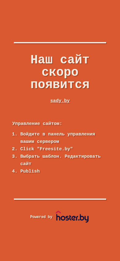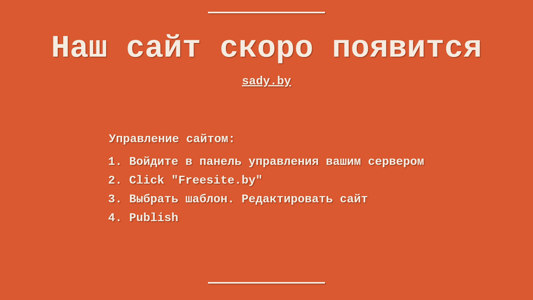 | AI-анализ | --- This online resource, titled "Наш сайт скоро появится" (Our site is soon to appear), is associated with the domain sady.by. The description mentions the upcoming availability of the site and provides instructions for site management. Users are directed to "Freesite.by" to select a template, log in to the control panel to manage their server, and publish their site. The site is powered by unspecified software. |