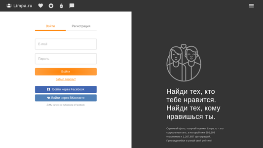 | AI-анализ | language: ru This website is a Russian social network called Limpa.ru, with over 692,000 users and 1.27 million photos. Users can register, create a profile, find people they like, and evaluate photos to receive ratings. Features include a guestbook, diary, photo moderation, tests, and settings. Users can log in using Facebook or VKontakte. The website does not publish content on Facebook. |