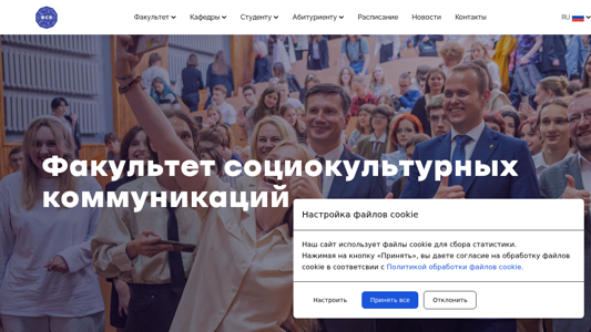 | AI-анализ | --- This online resource belongs to the Belarusian State University's Faculty of Socio-Cultural Communications (ФСК). The website provides information about the faculty, its structure, and academic offerings. Key topics include departments, faculty members, student organizations, and educational programs such as undergraduate studies, postgraduate studies, and preparatory courses. The faculty has over 30 members affiliated with various creative unions in the Republic of Belarus and offers 13 specialties across 10 departments. The website is available in Russian, English, and Belarusian, with sections for news and contacts. |