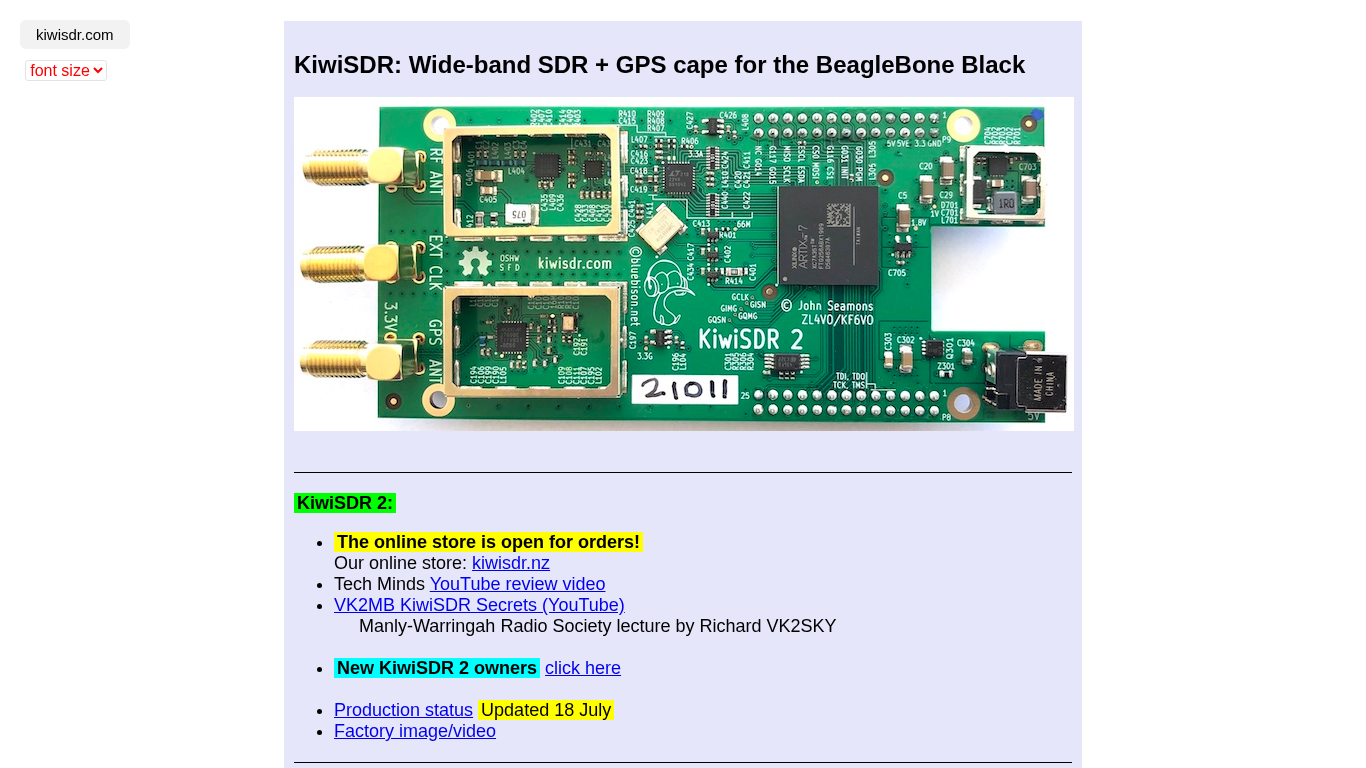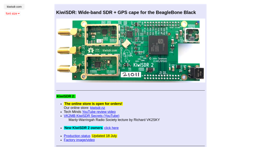 | AI-анализ | This website is dedicated to the KiwiSDR: a wide-band software-defined radio (SDR) receiver for the BeagleBone Black, which also includes a GPS cape. The website provides various resources for users, including a store for purchasing the KiwiSDR, a forum for community support, and links to live receivers and signal strength information. The website also includes downloadable documents, such as installation guides and design reviews, and a change log for updates. Users can access the KiwiSDR receivers through a list/map of available devices, which includes signal strength and propagation information. The website also provides information on how to reset a KiwiSDR's root and debian account passwords, which were recently set due to security changes. The website's top words include "kiwisdr," "and," "the," "kiwi," and "sdr." |